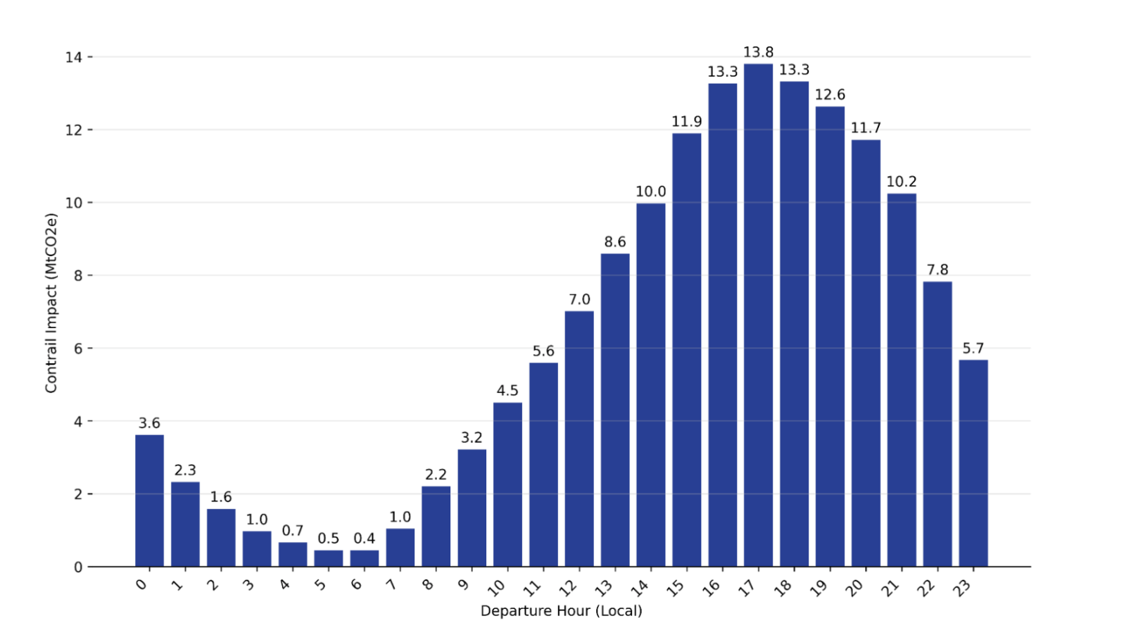 - Flight timing: flights departing in the afternoon tend to contribute to a higher contrail impact, as the contrails formed during this period are eventually persisting into the night.